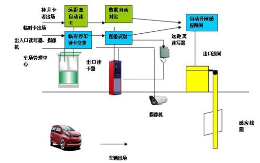 持月卡汽车行驶到出场读写器的感应线圈内,读写器会自动进行识别卡,并卡信息上传到后台服务器,电脑会自动进行记录、扣费,控制道闸自动开闸。司机开车入场,压到道闸地感线圈,道闸自动关闭。