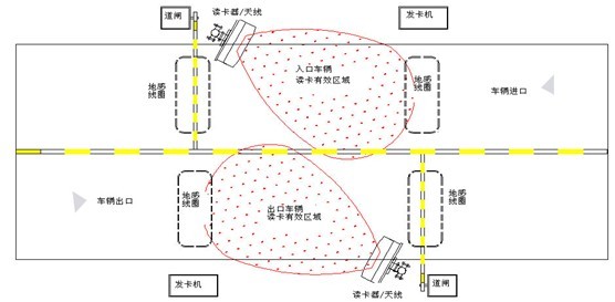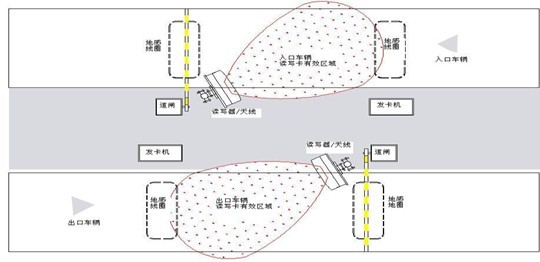 道路中间没有设安全岛,读写器或天线装在道路两旁,两两相对安装,避免读卡有效区域重叠。