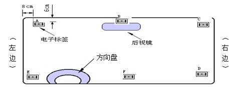 电子标签的位置:如果射频天线安装在前进方向路的左边(司机边),那么标签也应安装在汽车挡风玻璃的左边(A、E位)。如果天线安装在前进方向路的右边(付驾驶边),那么标签也应贴在汽车挡风玻璃的右边(C、D位)。如果天线安装在车道的正上方,则标签应安装在车内后视镜或汽车挡风玻璃中心线附近位置(B、F位)。对于小型车(含普通面包车),电子标签应尽量安装在前挡风玻璃的上方(A、B、C位)。对于大型车(大卡车或大客车等),电子标签应适当往前挡风玻璃下方(D、E、F位)方向安装。一般是以不遮挡驾驶员的视线为原则。